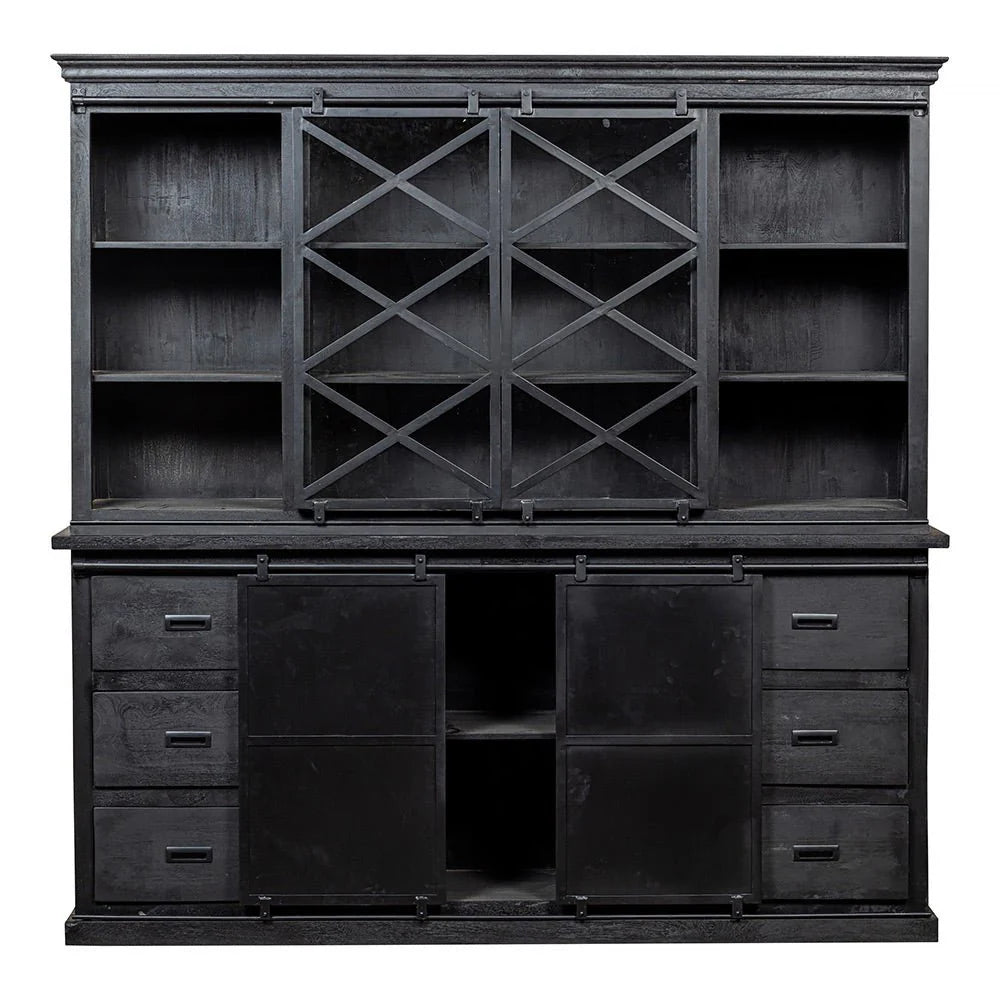 Een fraaie buffetkast zoals deze wilt toch iedereen wel? De kast heeft een stoer uiterlijk door de combinatie van het mangohout met de zwartmetalen accenten, waardoor de kast in elke ruimte zal opvallen! De bovenkant bevat zes vakken om het servies te bewaren, waarvan u zelf kunt bepalen welk deel u door de glazen schuifdeur afschermt. De onderkant bevat twee vakken achter een stalen schuifdeur met daarnaast drie lades om kleinere gebruiksvoorwerpen op te bergen.